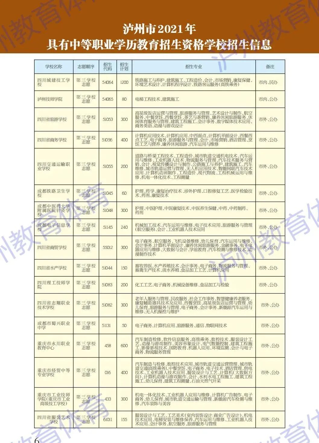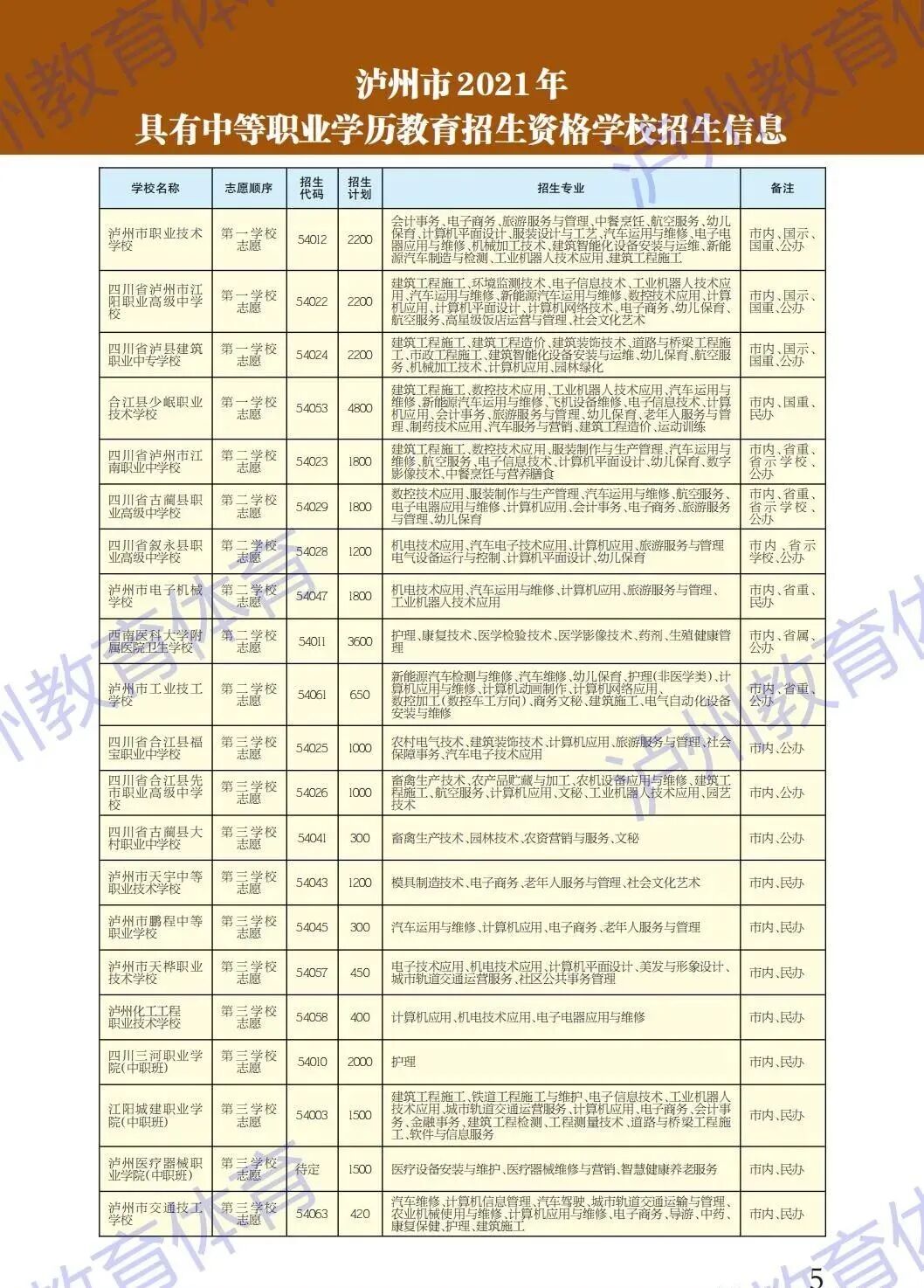 日前,泸州市教育和体育局印发了《泸州市2021年初中学业水平考试暨高中阶段学校招生工作实施方案》,公布了泸州市2021年具有中等职业学历教育招生资格学校名单,全市共38所,其中,市内学校23所,市外15所。(学校名称、志愿顺序、招生代码、招生计划、招生专业等相关信息,详见下图)备注: