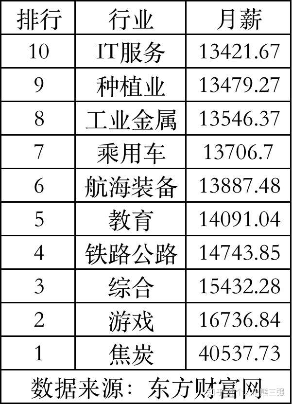 东方财富网的统计样板是招聘网站公开的岗位薪酬,排名前三的分别是焦炭、游戏、综合。两者的样本数量都很充分,结果都具有参考价值。当然还有薪酬最低的行业。