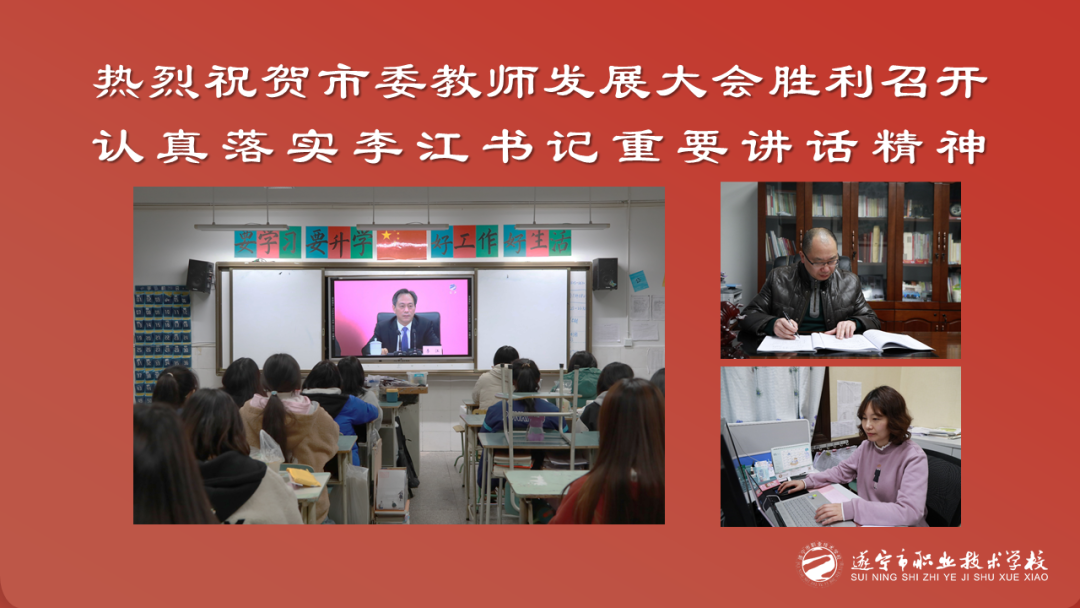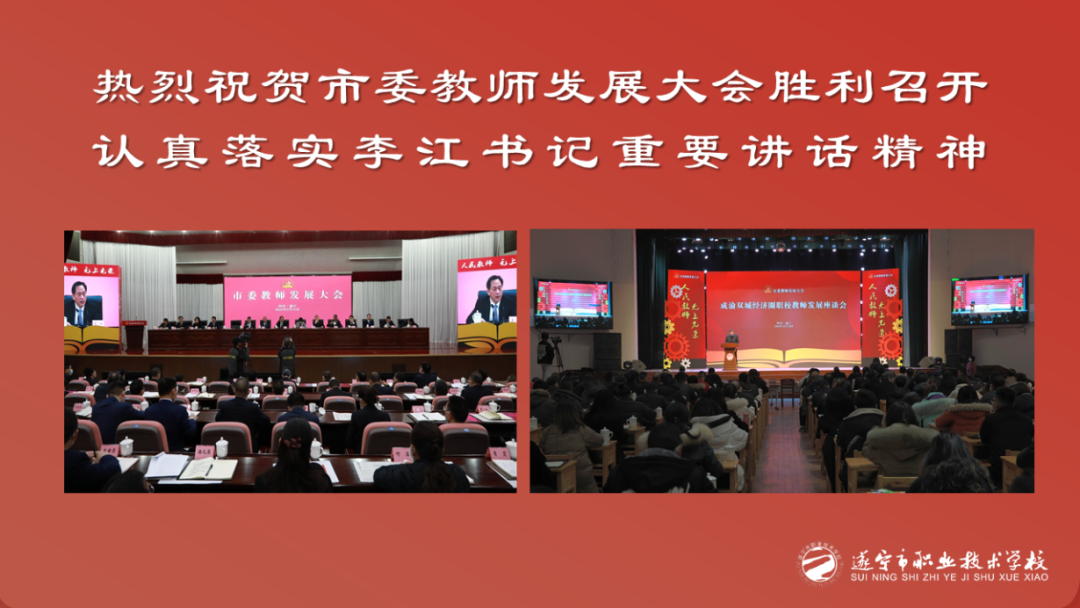 2月14日上午市委教师发展大会召开,市委书记李江出席会议并讲话;下午,成渝双城经济圈职校教师发展座谈会在遂宁市职业技术学校召开。5名职教老师分别交流分享成长感悟。