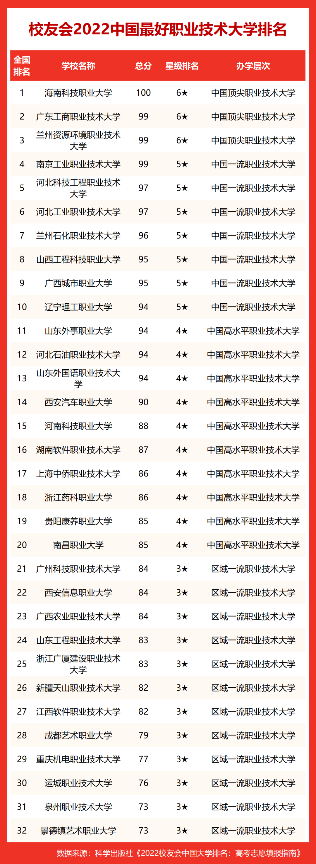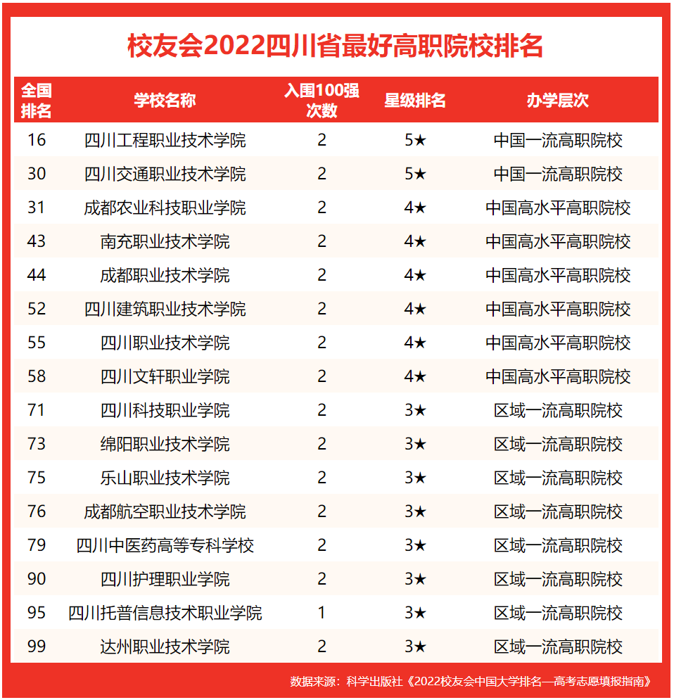 在校友会2022中国最好高职院校排名上榜的四川省高职院校中, 四川工程职业技术学校综合实力排名最高,办学水平最高,2021-2022年,2次跻身全国100强,排名2022年全国第16名,荣登校友会2022四川省最好高职院校排名第一。四川交通职业技术学校2次跻身全国100强,全国排名第30名,名列第2。成都农业科技职业学校2次跻身全国100强,全国排名第31名,高居第3。