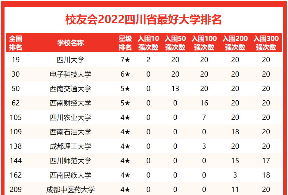 榜单显示,在校友会2022中国最好大学排名上榜的四川省高校中, 四川大学实力最强,2003-2022年,2次跻身全国10强,位列2022年全国第19名,荣登校友会2022四川省最好大学排名冠军。电子科技大学20次跻身全国50强,全国排名第30名,排行第2。西南交通大学13次跻身全国50强,全国排名第50名,位居第3。