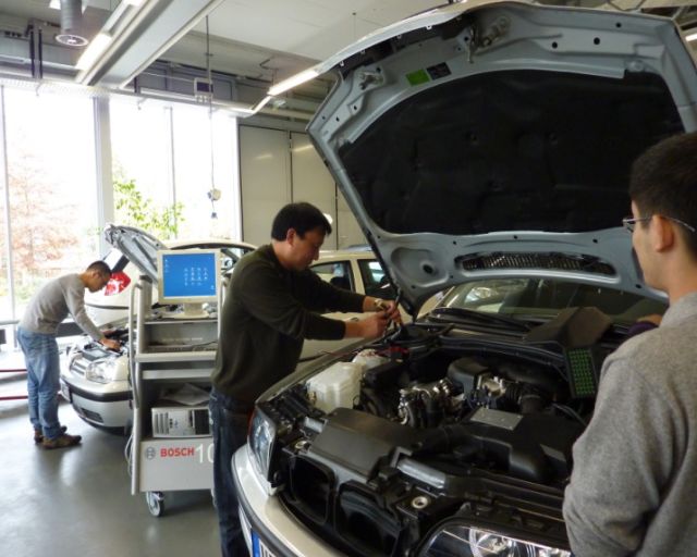 2014年学校同中德诺浩教育有限公司合作办学,全面引进德国汽车机电服务技师等职业资格证书的教材、课件与软件及培养方式,并将德国汽车机电服务技师等职业资格证书的课程体系与学校汽车相关专业大学学历课程进行嵌入式套读。目前在校中德诺浩班学生近300人,第一届中德诺浩学生已在成功就业,第二届中德诺浩学生已在中德诺浩实训基地参加顶岗实习;同时学校有12名专业课教师赴德国参加中德诺浩专业教师培训,19名汽车专业课教师参加中德诺浩国内培训分别获得KST证书、KSMT证书和KMT证书。