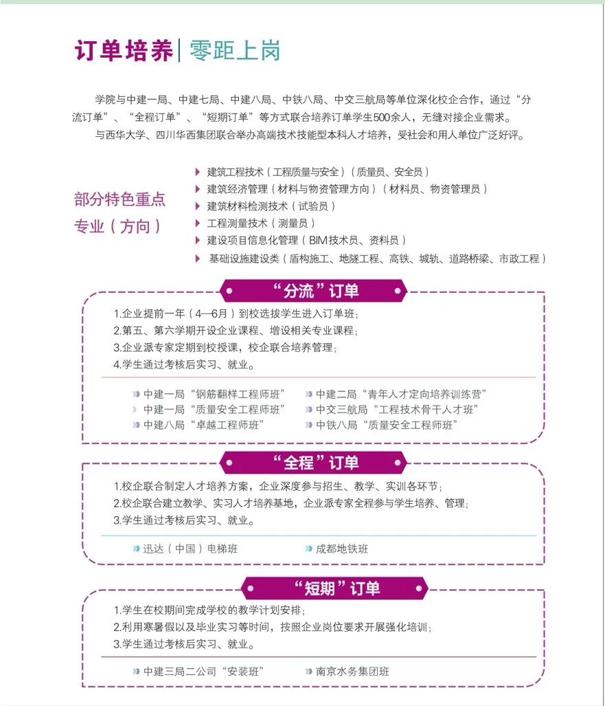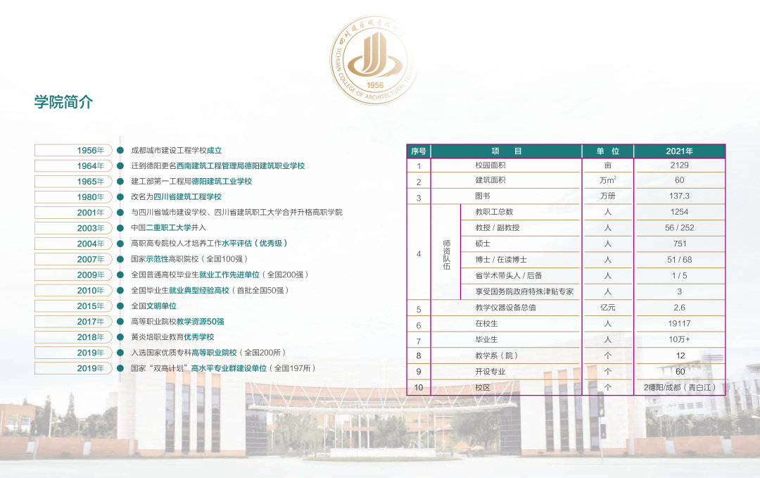 四川建筑职业技术学校是公办全日制高等院校,隶属于四川省住房和城乡建设厅。学校是全国优质专科高等职业院校,入选国家“双高计划”高水平专业群建设单位,全国普通高校毕业生就业工作先进单位,首批全国毕业生就业典型经验高校,全国住房和城乡建设职业教育教学指导委员会副主任单位。学校专业设置以土建、交通、管理类专业为主,兼顾装备制造、电子信息、财经、测绘、材料、水利、人文等多专业多学科协调发展。