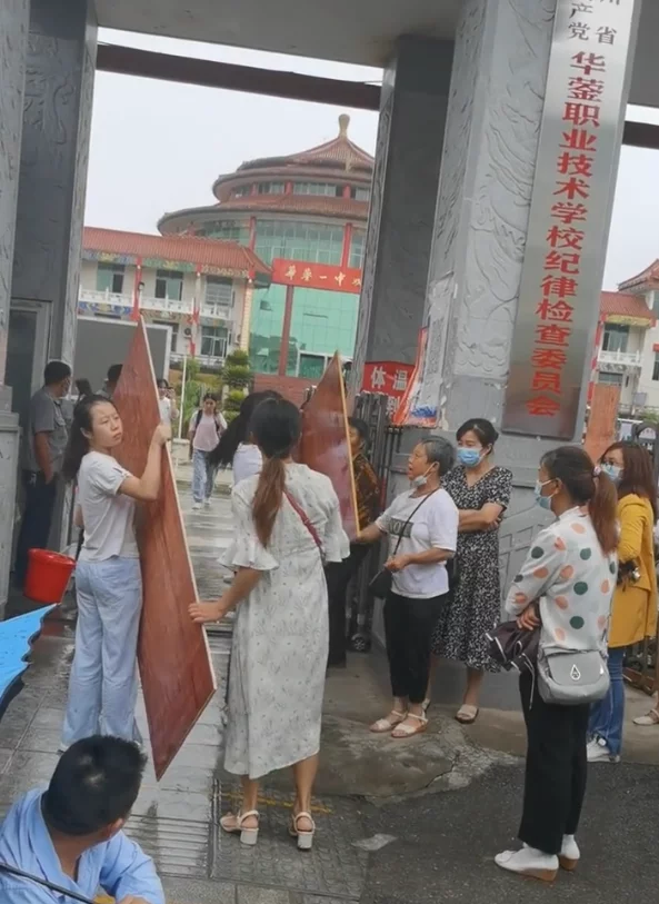 爆料视频显示,不少学生家长拿着床板在学校门口外聚集。
