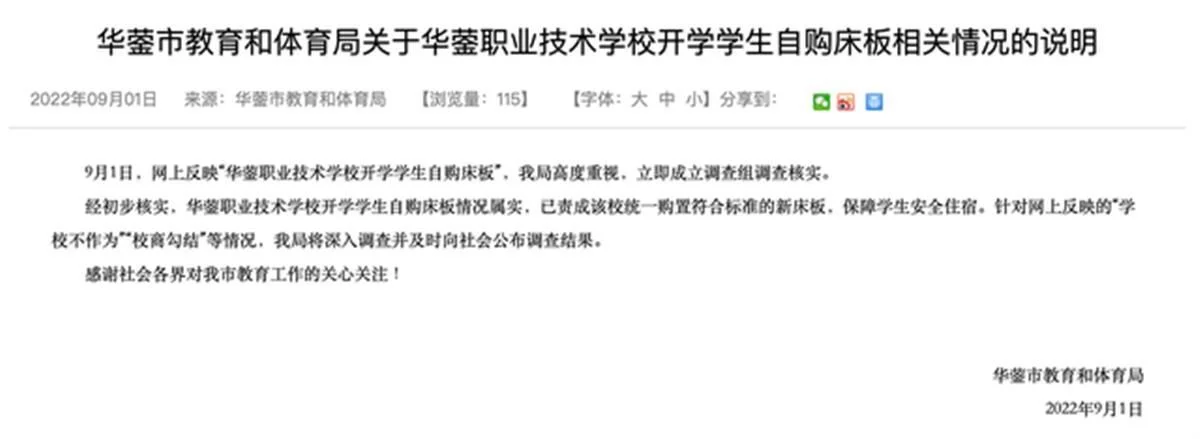 近日,四川广安,有网友发布视频称,华蓥职业技术学校(一中校区)要求学生开学时自带床板。随后,四川华蓥市教育和体育局发布说明称,情况属实,已责成该校统一购置符合标准的新床板,保障学生安全住宿。(据9月2日新京报)