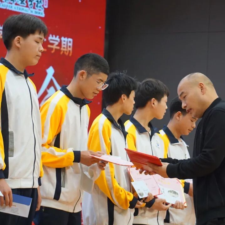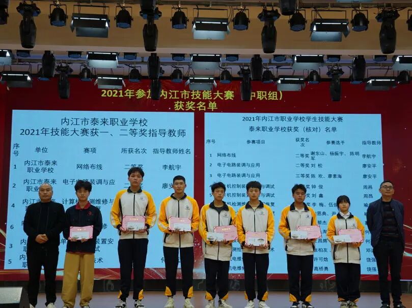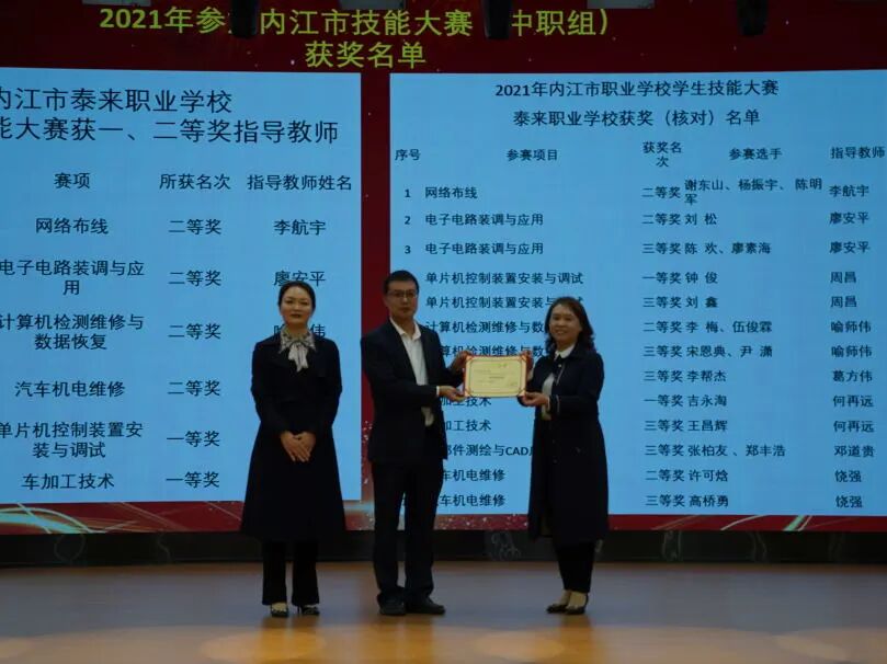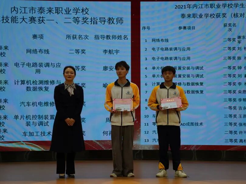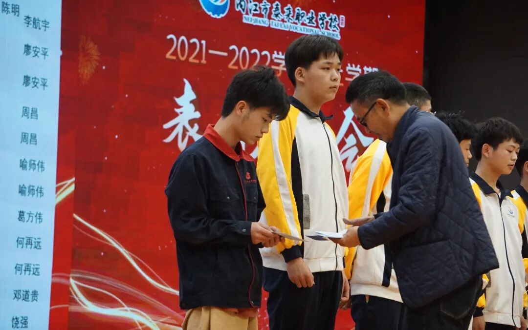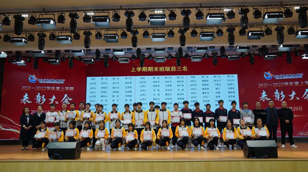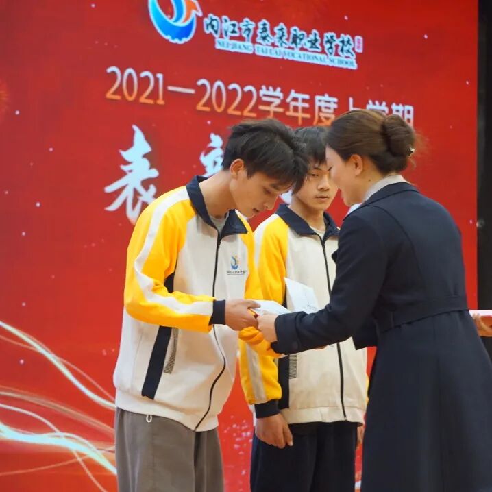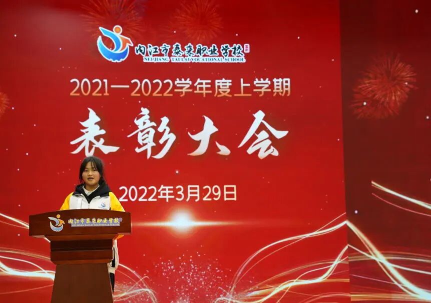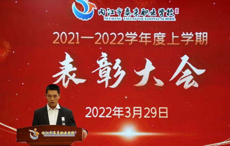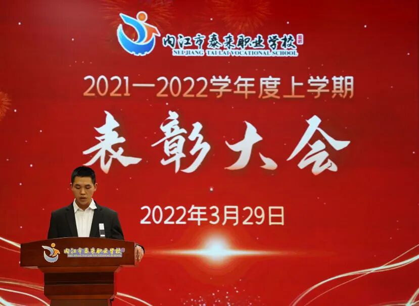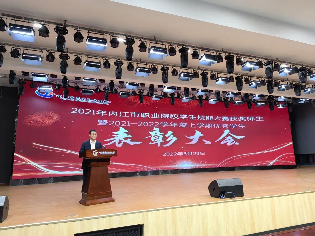 会上,康荣生首先对上期教学工作作了简要回顾。并宣布上学期期末统考获得班级前三名同学名单,邀请中层干部为学生颁奖。随后,周珍校长宣布2021年内江市职业院校技能大赛(中职组)获奖师生名单,并邀请曾甜甜等校级领导为师生们颁奖。颁奖结束后,优秀学生代表郑味德同学分享了学习经验和方法,感谢老师和父母的关心和帮助,呼吁同学们用优秀的成绩来回报学校和父母。优秀指导老师代表何再远表示,在今后的工作中将更加努力,真正做到“为人师表,教书育人”,为学校的蓬勃发展作贡献。