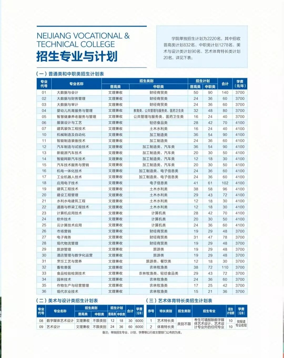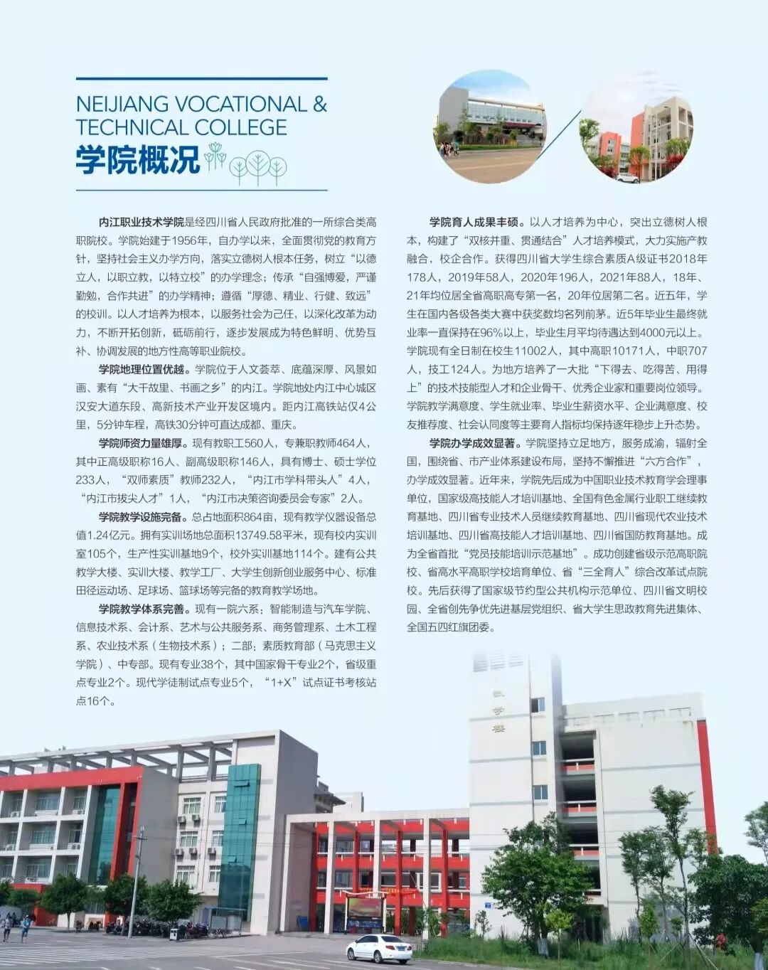 内江职业技术学校是经四川省人民政府批准的一所综合类高职院校。学校始建于1956年,自办学以来,全面贯彻党的教育方针,坚持社会主义办学方向,落实立德树人根本任务,树立“以德立人,以职立教,以特立校”的办学理念;传承“自强博爱,严谨勤勉,合作共进”的办学精神;遵循“厚德、精业、行健、致远”的校训。以人才培养为根本,以服务社会为己任,以深化改革为动力,不断开拓创新,砥砺前行,逐步发展成为特色鲜明、优势互补、协调发展的地方性高等职业院校。