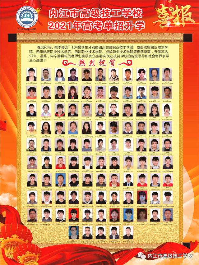 春风化雨,桃李芬芳!市高级技工学校104名学生金榜题名,分别被四川交通职业技术学校、成都航空职业技术学校、四川航天职业技术学校、四川职业技术学校等提前录取,升学率达92%。