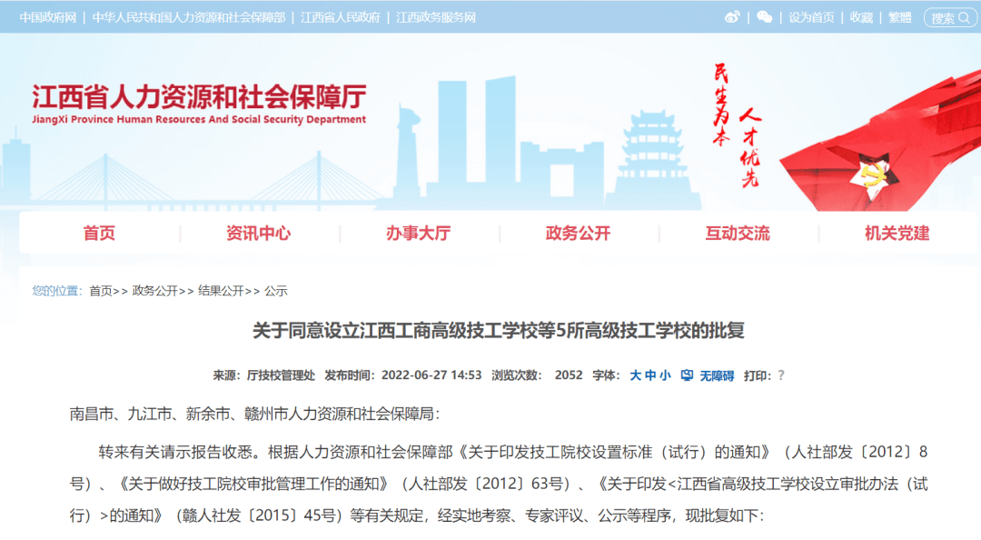 转来有关请示报告收悉。根据人力资源和社会保障部《关于印发技工院校设置标准(试行)的通知》(人社部发〔2012〕8号)、《关于做好技工院校审批管理工作的通知》(人社部发〔2012〕63号)、《关于印发<江西省高级技工学校设立审批办法(试行)>的通知》(赣人社发〔2015〕45号)等有关规定,经实地考察、专家评议、公示等程序,现批复如下: