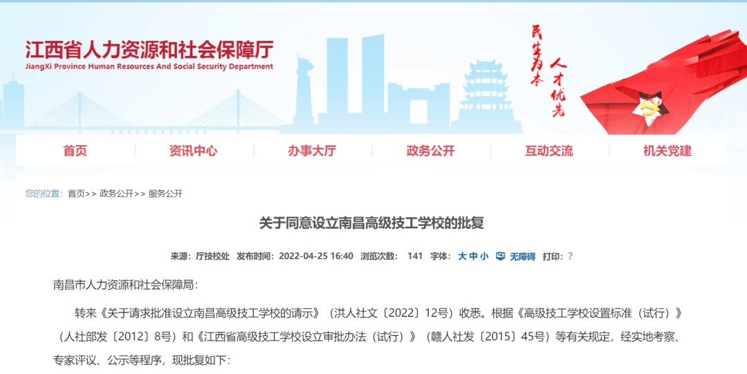 转来《关于请求批准设立南昌高级技工学校的请示》(洪人社文〔2022〕12号)收悉。根据《高级技工学校设置标准(试行)》(人社部发〔2012〕8号)和《江西省高级技工学校设立审批办法(试行)》(赣人社发〔2015〕45号)等有关规定,经实地考察、专家评议、公示等程序,现批复如下: