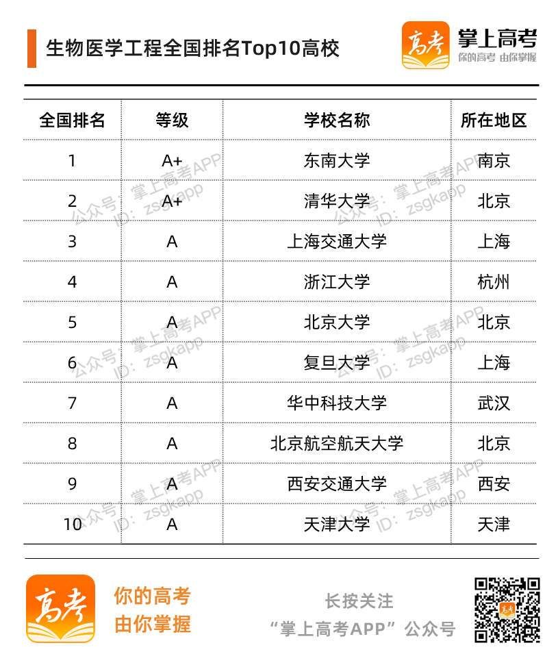 在2021年软科中国大学专业排名榜单中,共有68所院校的生物医学工程专业上榜。Top 10 院校排名如下: