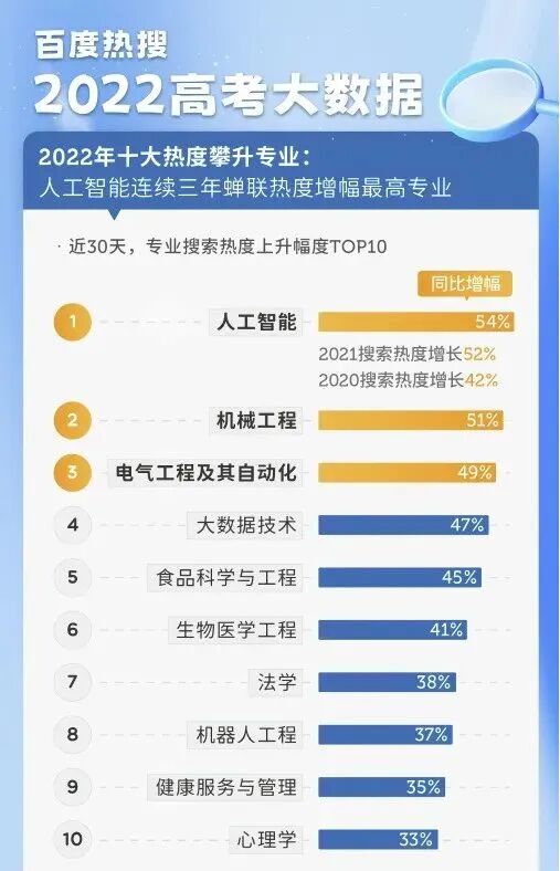 相比去年,人工智能、机械工程、电气工程及其自动化、大数据技术、食品科学与工程、生物医学工程、法学、机器人工程、健康服务与管理、心理学等专业热度涨幅不断攀升。(如图下所示)