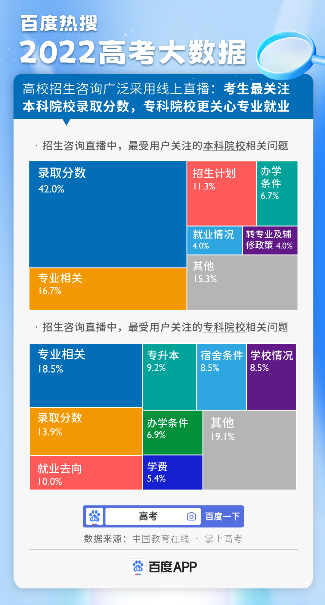 最受用户关注的本科院校相关问题中,考生和家长对录取分数、招生计划等情况尤为上心。相比之下,在最受用户关注的专科院校相关问题中,考生、家长更喜欢站在未来发展和就业出路的角度提出问题,其中专业相关问题占比约为18.5%,就业去向和专升本的比例合计接近20%。