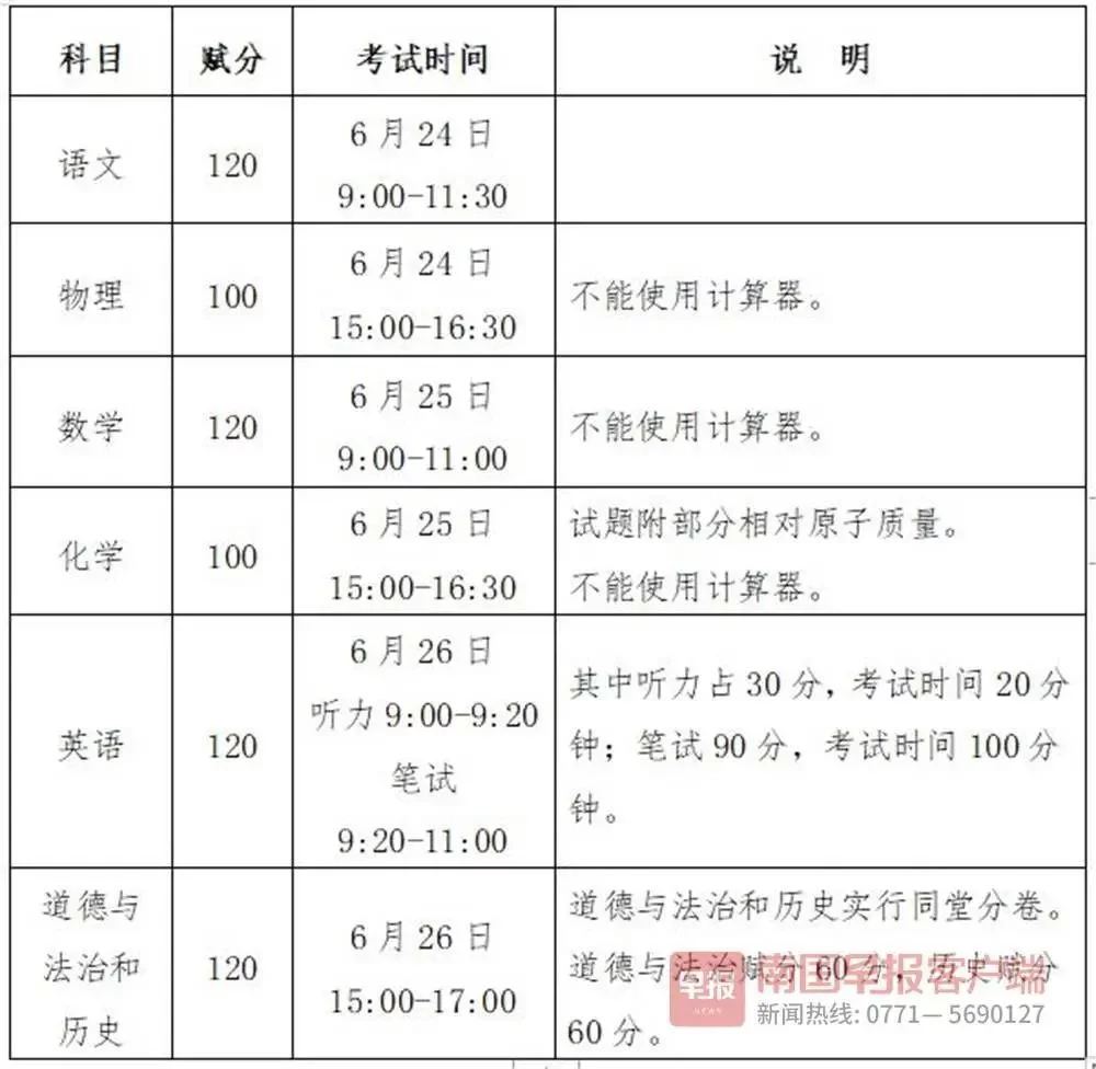 其中,语文、数学、英语、物理、化学、道德与法治、历史采用广西北部湾经济区初中学业水平考试试题,考试成绩列入初中学业水平考试计分科目。