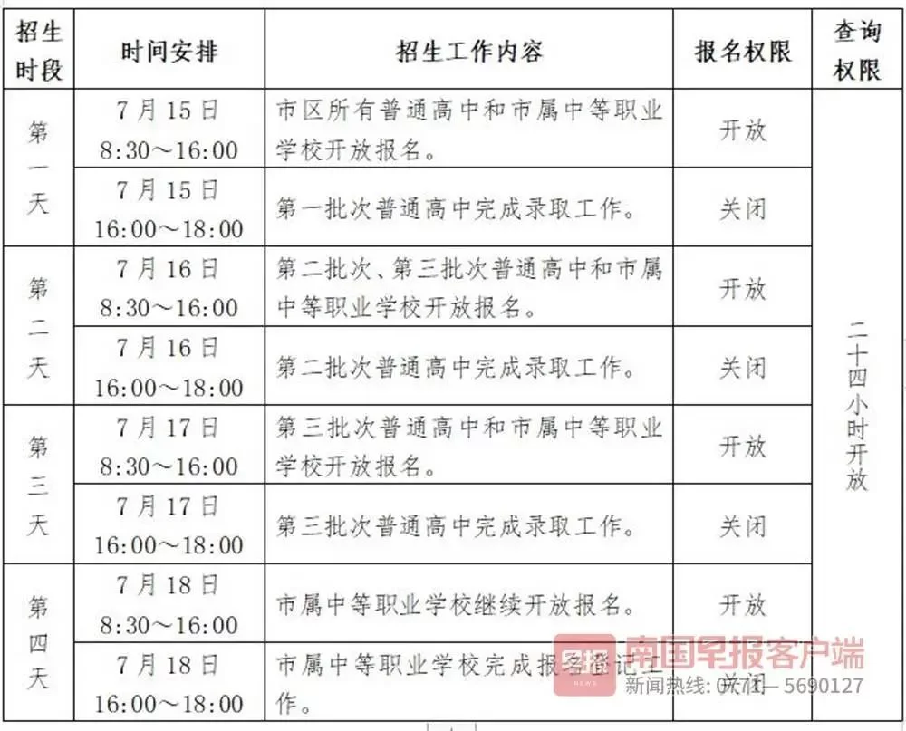 南宁市区高中阶段学校统一招生工作在7月15日至18日进行,其中普通高中招生在7月15日至17日三天时间内进行,在录取时间内各校的指令性(含定向生和非定向生)和指导性招生计划同时完成。