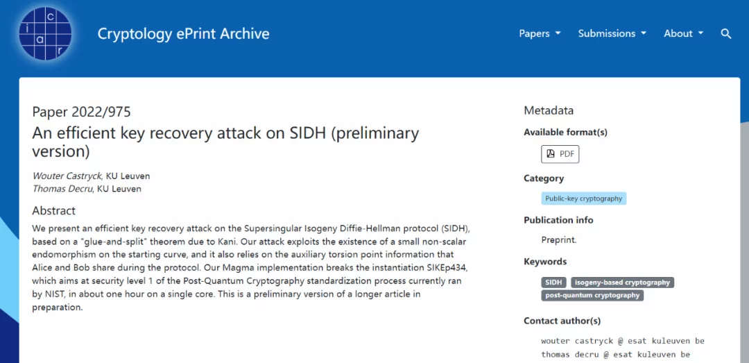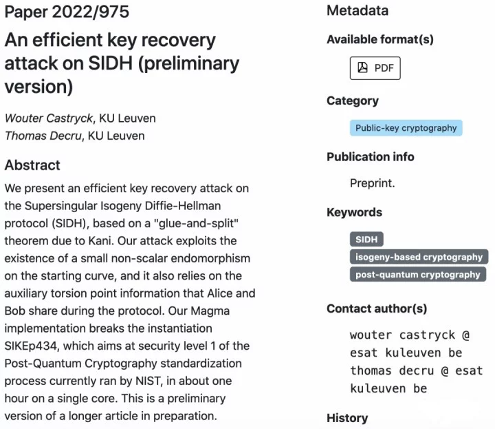 结果在研究相关文献的时候,发现了一篇 1997 年的论文。论文中,有一个 “ 几乎立即适用于 SIKE 算法 ” 的定理,以至于他们在两天之内 “ 反向加强 ” 了 SIKE 算法,并用台式机破解了它。这就邪门了呀,要知道在此之前这个算法的破解已经 10 年没有进展了,而托马斯只用了两天,甚至还写出了一个没有 bug 的破解程序。不仅是密码学家,就连程序员都得羞愧难当了。8 月 5 日,他们在一篇论文中记录了这一神奇的破解方法: