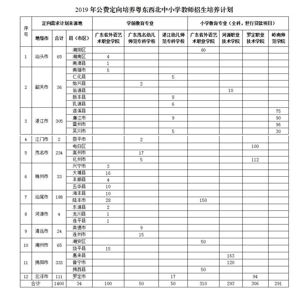 第三种为“公费定向”(1. 为粤东西北地区11个地级市共25个县(市、区)公费定向培养200名初中起点五年一贯制专科层次学前教育专业教师。2. 为14个世行贷款项目县(市、区)公费定向培养1200名初中起点五年一贯制专科层次小学教育专业(全科)教师)。