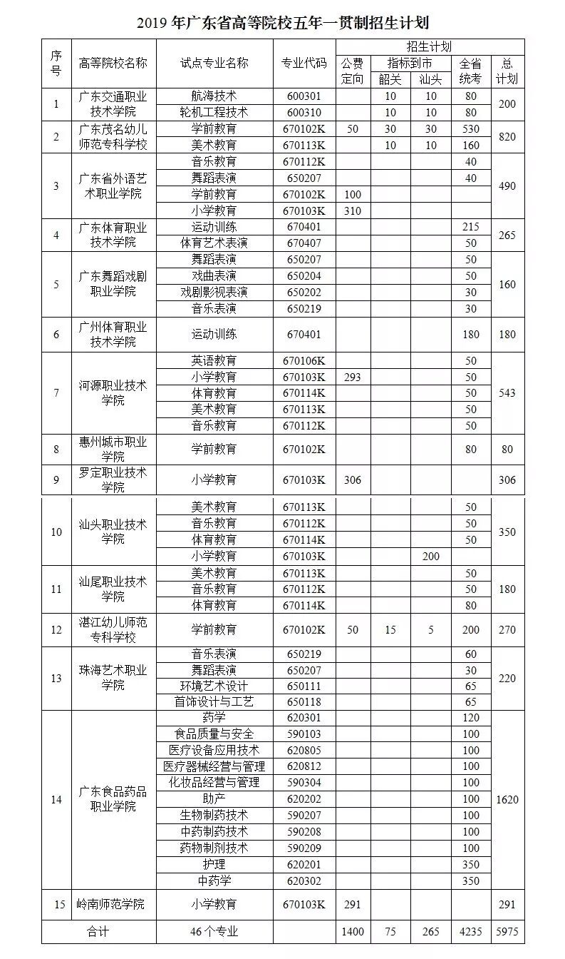 2019年招生院校及招生专业计划,详见《2019年广东省高等院校五年一贯制招生计划》(见文后)。