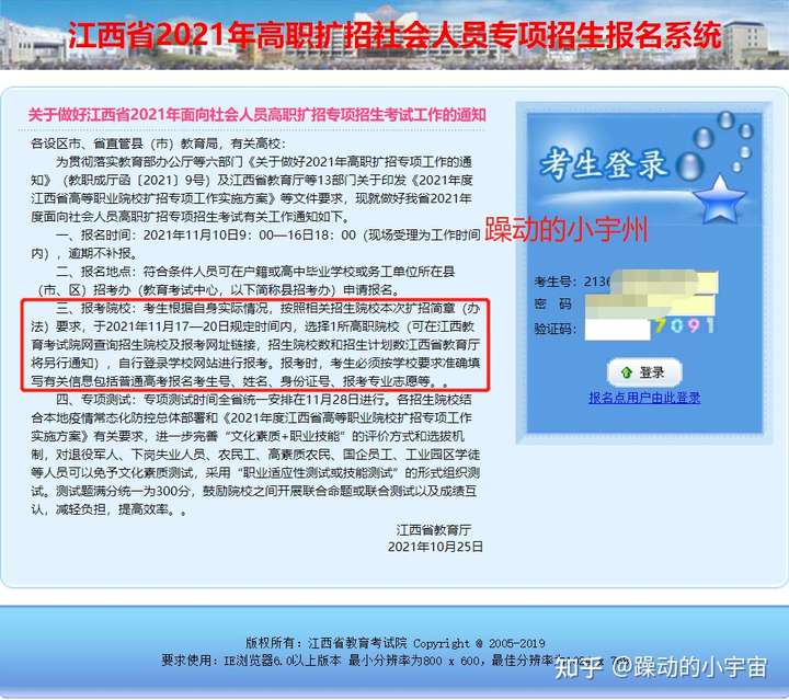考生根据自身实际情况,按照相关招生院校本次扩招简章(办法)要求,于2021年11月17—20日规定时间内,选择1所高职院校(可在江西教育考试院网查询招生院校及报考网址链接,招生院校数和招生计划数江西省教育厅将另行通知),自行登录学校网站进行报考。报考时,考生必须按学校要求准确填写有关信息包括普通高考报名考生号、姓名、身份证号、报考专业志愿等。。