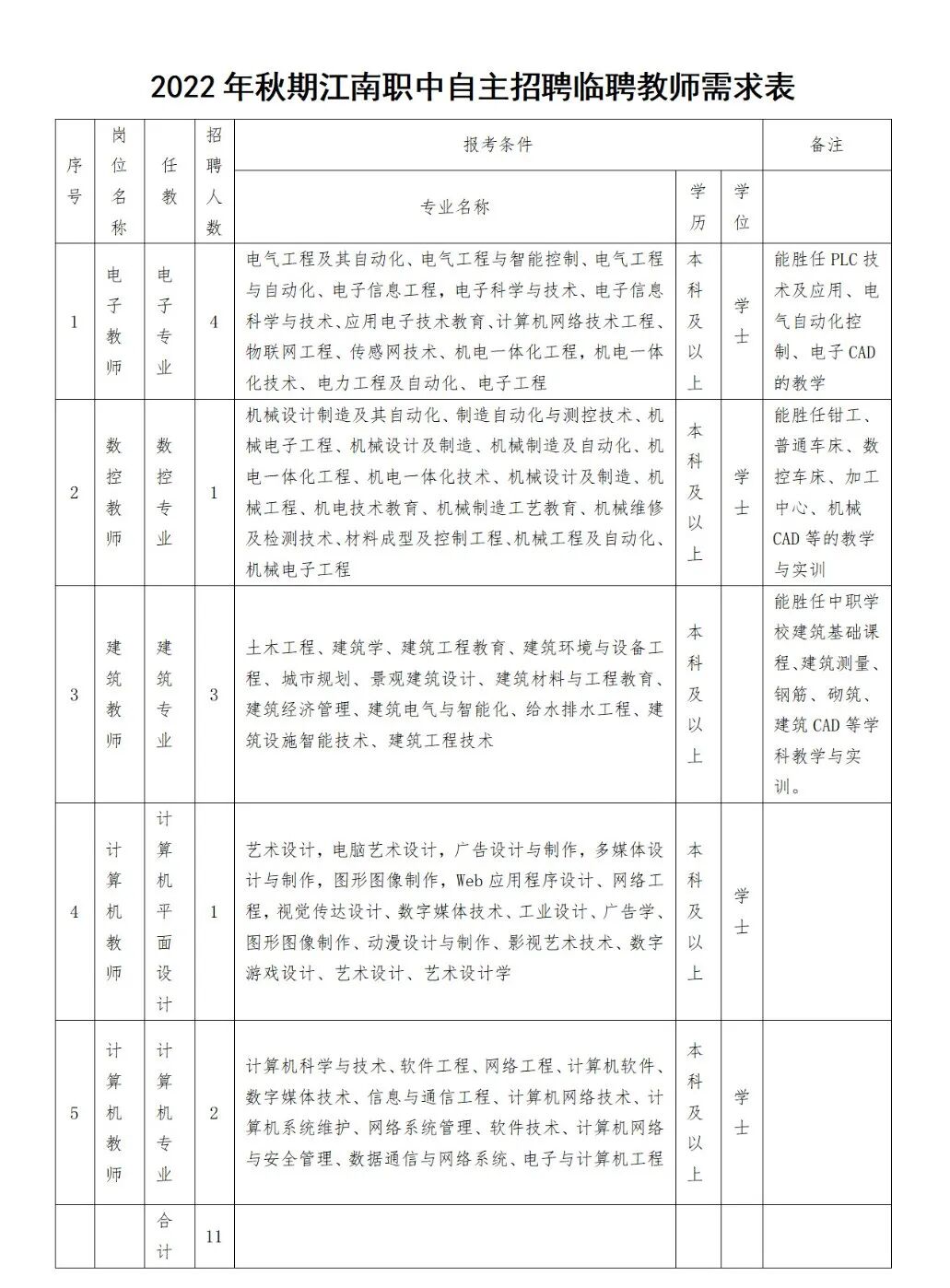 因学校发展需要,现面向社会公开自主招聘临聘教师11名,现将有关事项公告如下: