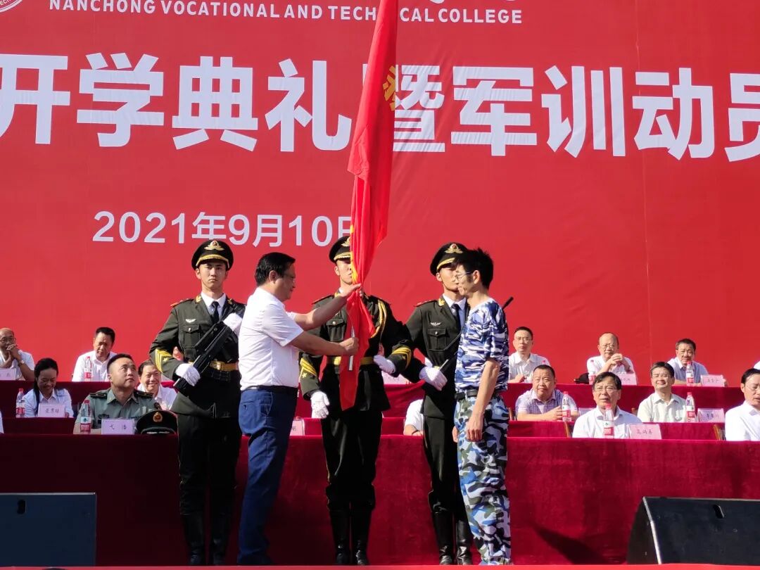 议程第八项:学校党委书记黎明为军训团授旗并宣布南充职业技术学校2021级新生军训开训。