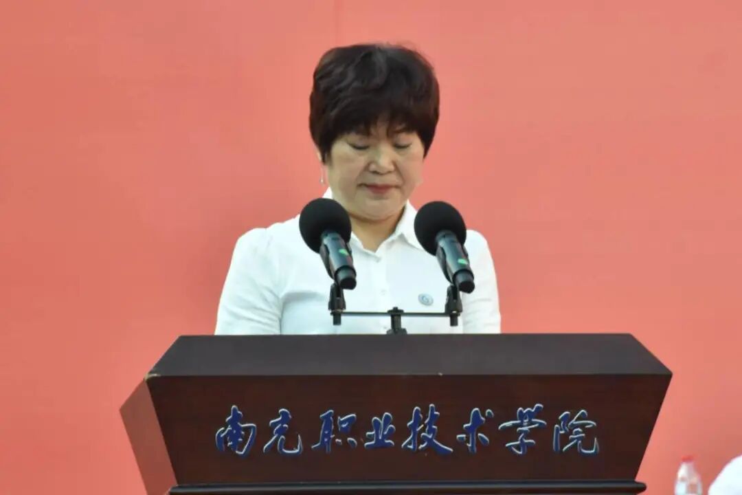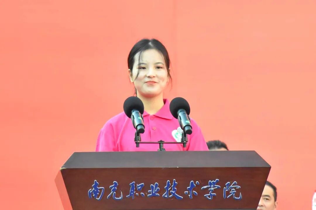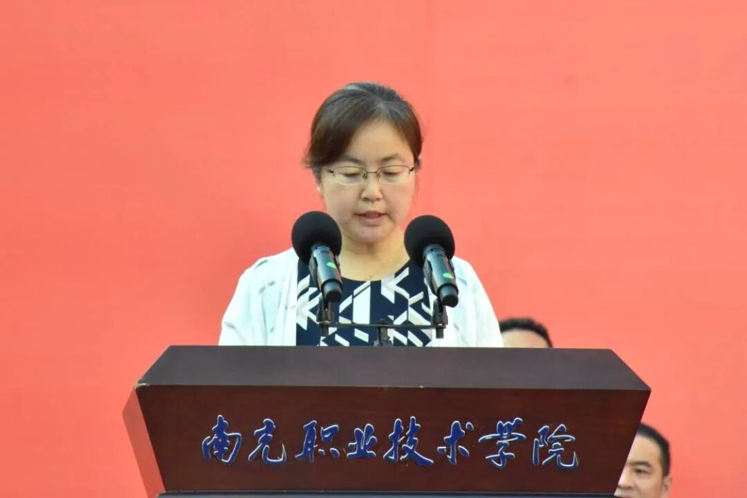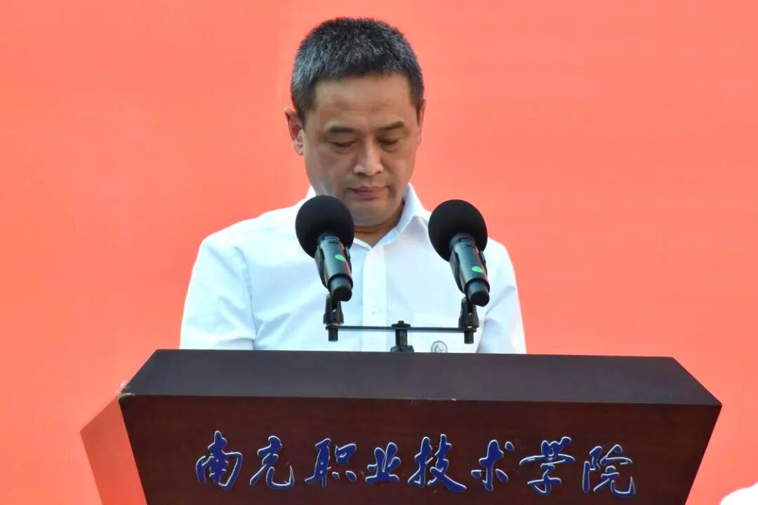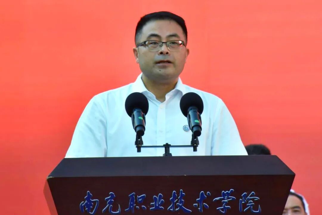 议程第五项:教师代表蒋江照博士上台发言。蒋江照博士首先代表全体老师向2021级的新生表示热烈欢迎,并对国家对职业教育的重视做出了强调,鼓励同学们对高等职业教育充满信心,希望同学们在南职未来的三年里能够眼中有光,心中有梦,脚下有路,绘出新篇章,毕业时能够问心无愧的大声说出“请党放心,强国有我!”