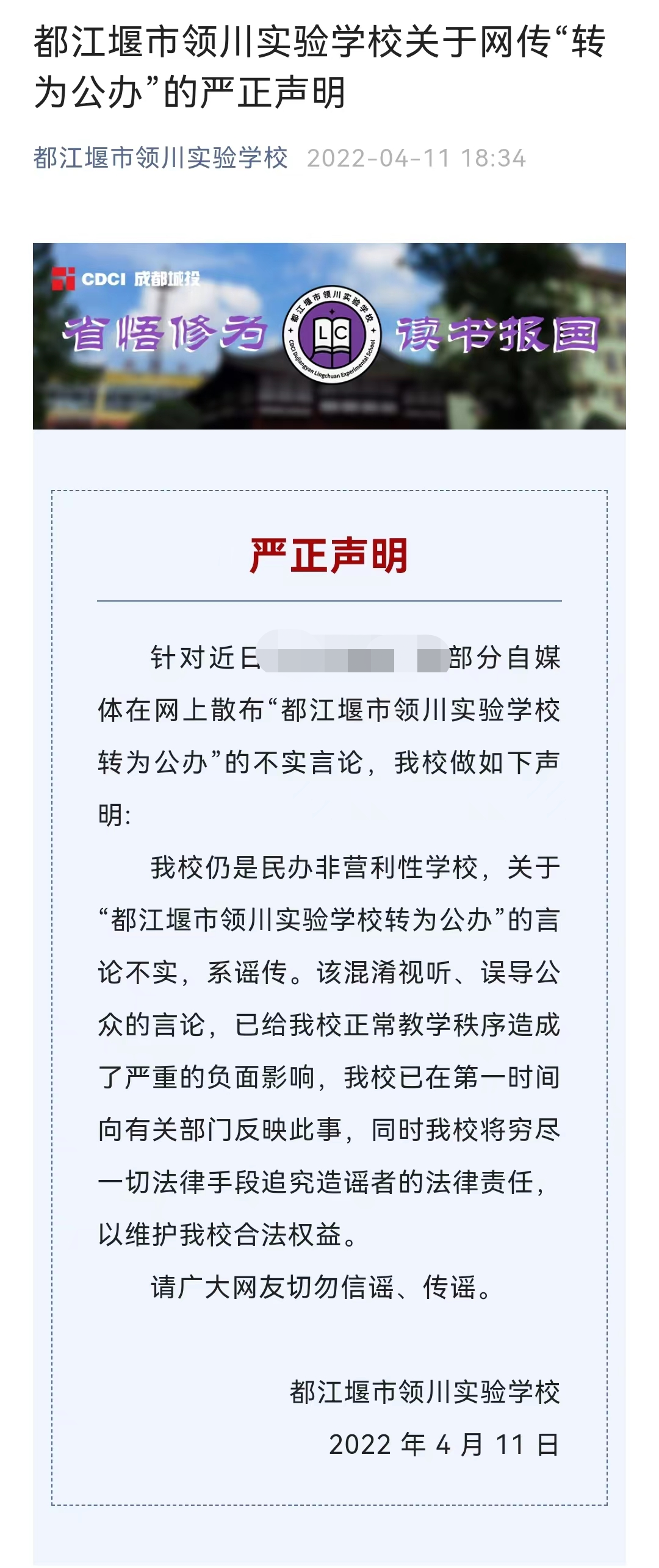 4月11日,都江堰领川实验学校发严正声明!