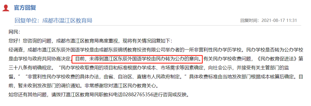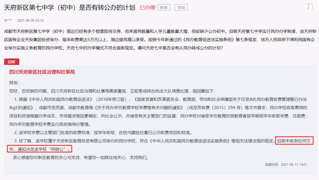 天府新区的官方回复中直言:学校属于天府新区教育投资有限公司举办的民办学校,符合《中华人民共和国民办教育促进法实施条例》等相关法律法规的规定。