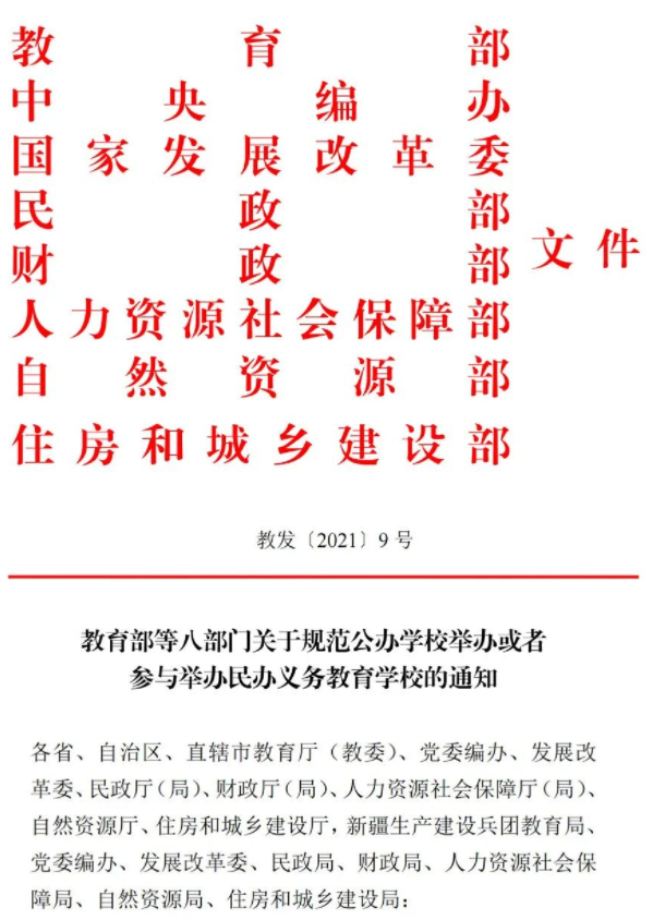 2021年8月,教育部等八部门发布《关于规范公办学校举办或者参与举办民办义务教育学校的通知》。