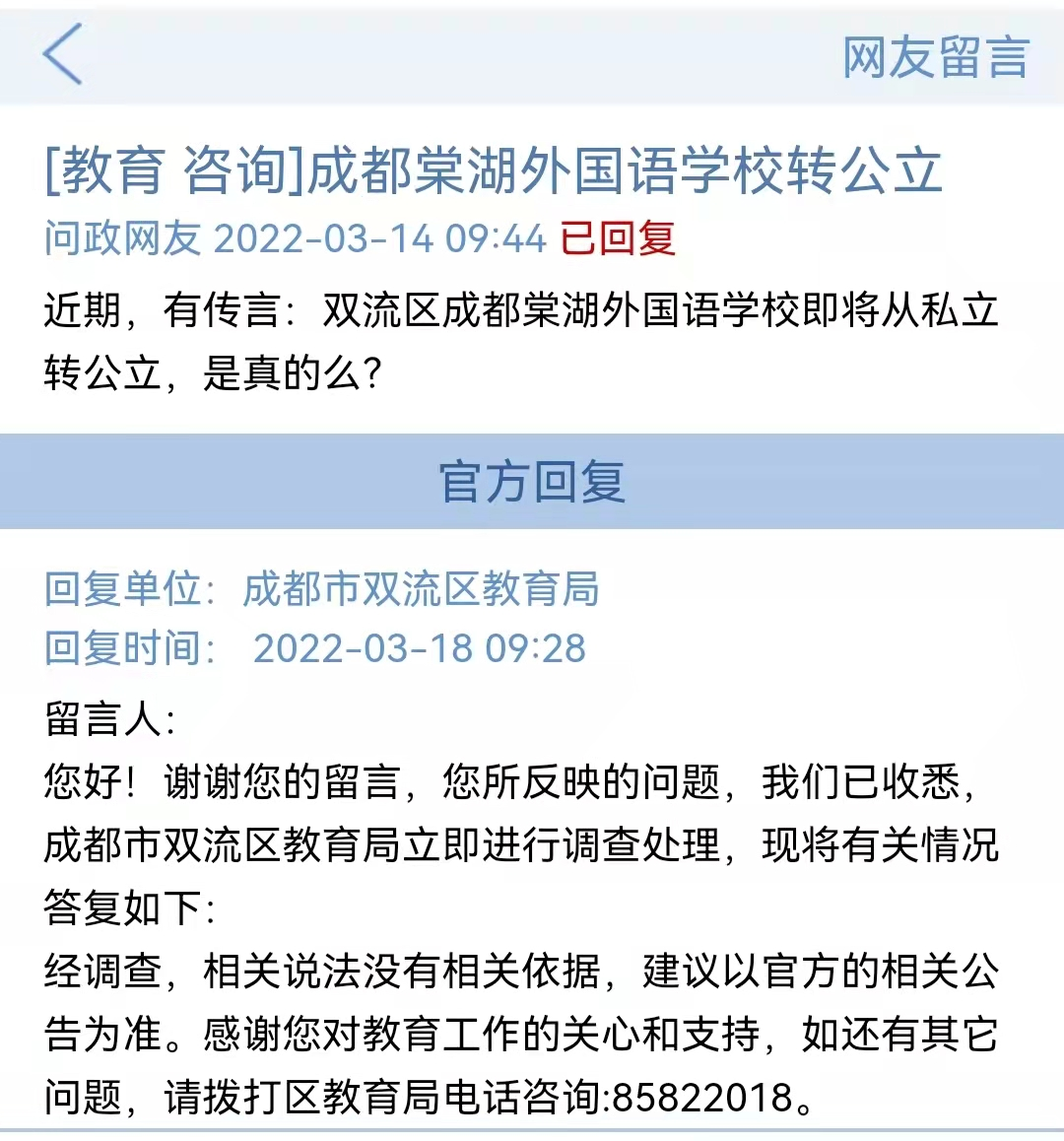 3月14日,有家长在“问政四川”留言:近期,有传言:双流区棠湖外国语学校即将从私立转公立,是真的么?