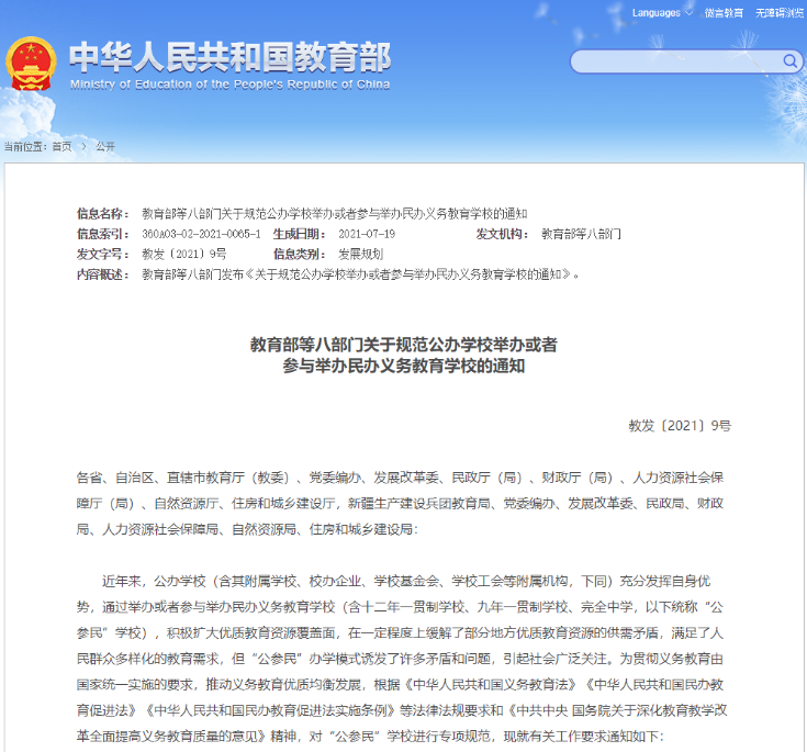 2021年7月,教育部等八部门印发了《关于规范公办学校举办或者参与举办民办义务教育学校的通知》,其中明确:“公办学校也不得以举办者变更、集团办学、品牌输出等方式变相举办民办义务教育学校。”