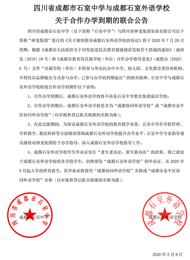 012020年,成都石室外语学校打响第一枪,脱钩四中,”不再是石室中学教育集团的成员”,更名为“成都协同外语学校”。