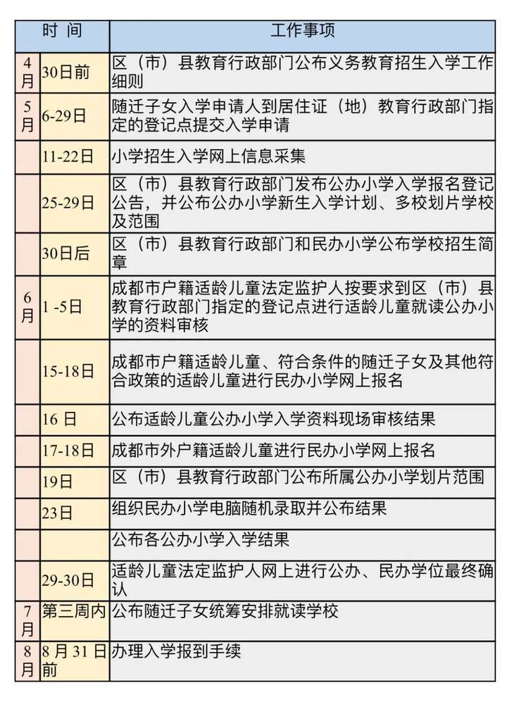 2020年成都市小学入学日程安排