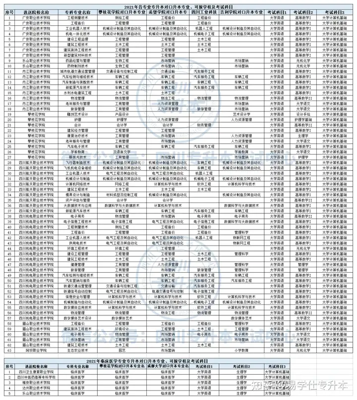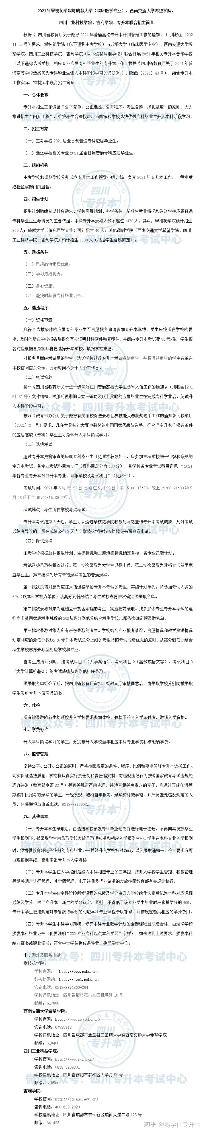 2021年专升本录取人数不超过1470人,其中,攀枝花学校预计招生300人;成都大学(临床医学专业)预计招生40人;其他调剂学校(西南交通大学希望学校、四川工业科技学校、吉利学校)预计招生1130人(根据学生自愿确定)。