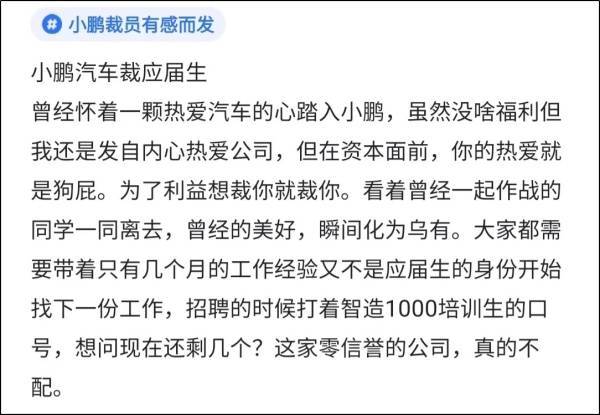 目前,在小鹏汽车的官网中,亮出的校园招聘岗位不足200个,根据媒体消息,小鹏汽车今年年初就有比例达30%的裁员计划,创始人何小鹏今年4月份还在社交平台叫惨,因上海疫情影响,上海周边的供应链企业不开工就可能面临停工停产的后果。