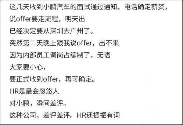5月20日消息,近日新能源车企小鹏汽车被曝出毁约近20位应届毕业生,被毁约应届生在社交平台中纷纷吐槽“HR会忽悠人”,“这家零信誉的公司真的不配”。