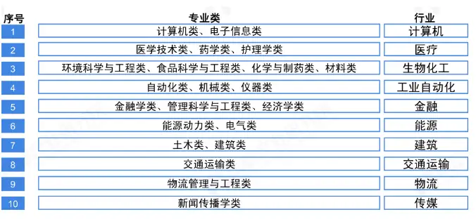 最终,我们将高考热门报考本科专业类TOP30归纳为十三大行业,选出当下最主流的十大行业。