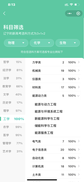 除了兴趣之外,还要考虑高中选科与专业的匹配度,考虑专业未来学习深造所需要的学科基础是否是自己擅长的,我们也可以使用蜻蜓志愿云平台的根据科目选专业功能进行查看。