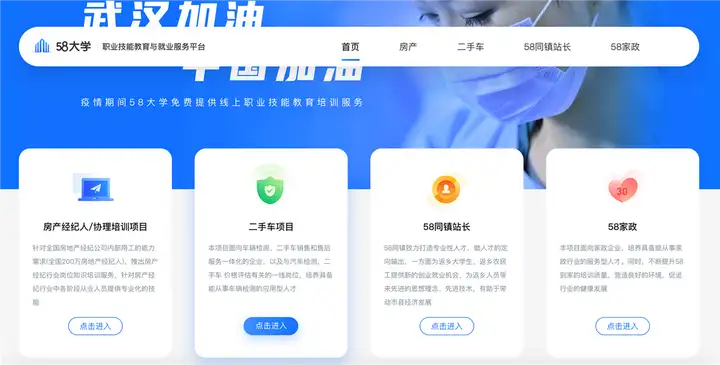 随着居民收入水平的提高、人口老龄化进程的加快,健康检测、康复照护等需求更加专业化、精细化,且量大面广。健康照护服务的大量需求派生出新职业。58大学涉及汽车、生活服务、房地产、信息化服务领域;主要有二手车鉴定评估师、母婴护理、保育员、家政服务员、房产经纪人、58同镇站长互联网能力提升等10个以上职业(工种/岗位)技能。