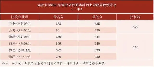 2021年武汉大学物理类录取最低分为639分,高出控制线119分,全省排名第4524名,历史类录取最低分为635,高出控制线77分,全省排名第631名。