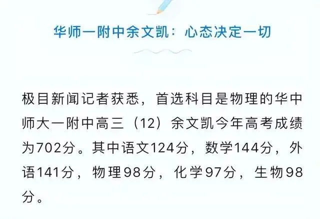 湖北2022年高考分数线出炉后,湖北2022年高考开始放榜,捷报不断,高分考生不断出现,其中湖北一考生高考总分702,首选物理,超过本科线293分,超本科特殊招生线198分,其中语文124分,数学144分,外语141分,物理98分,化学97分,生物98分。