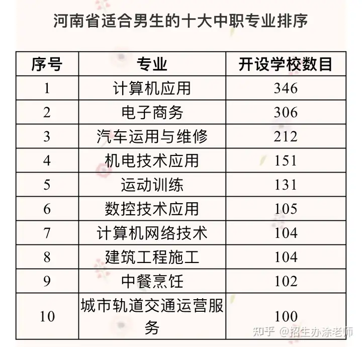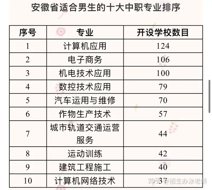 我们常说,一个专业火不火,重点就看开设的院校多不多,这是一个常识。当一个专业遍布大部分院校的时候,那你就知道这个专业的火爆程度了。下面两个表分别是河南省和安徽省适合男生选择的中职专业排名,读者们可以参考。