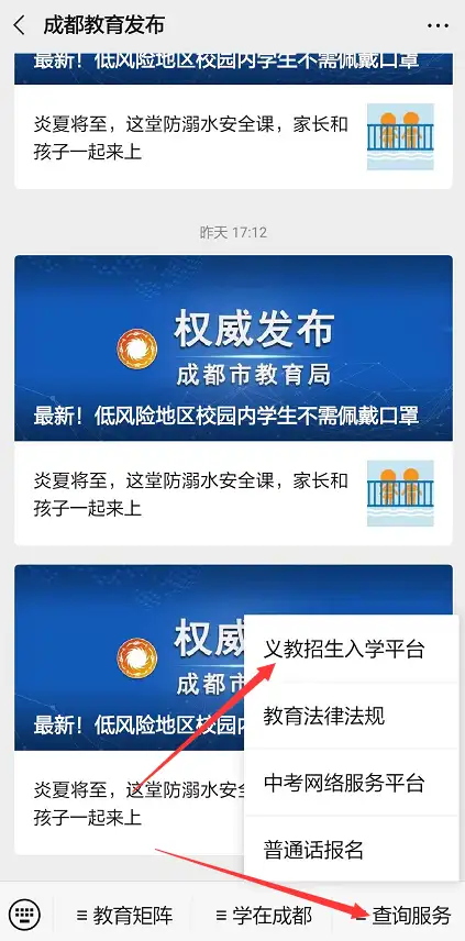 关注以下微信公众号或订阅号,点击相应菜单栏中的“成都市义务教育招生入学服务平台”进入成都市小学招生入学服务平台。