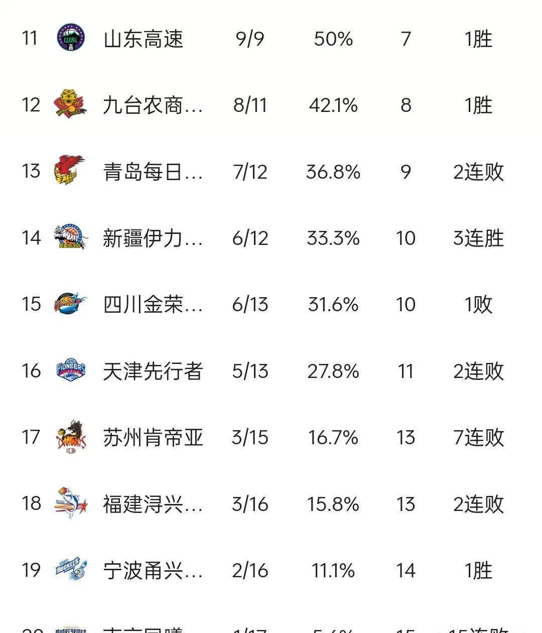 从九连胜到四连败,深圳降至第七位,广州战胜青岛后重回前八,北控双杀四川后排名上升一位回到第十,吉林赢球后回到第十二位,青岛第十三。