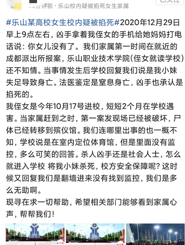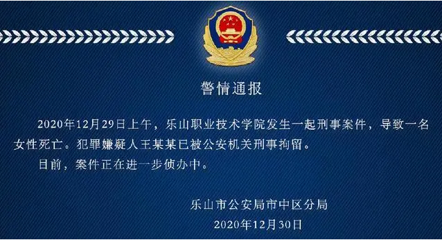 2020年12月29日,乐山职业学校的一名女生被害身亡,怀疑犯罪嫌疑人是该女子的男友,怀疑作案动机为情杀。但是此事到此还未得到警方的证实。