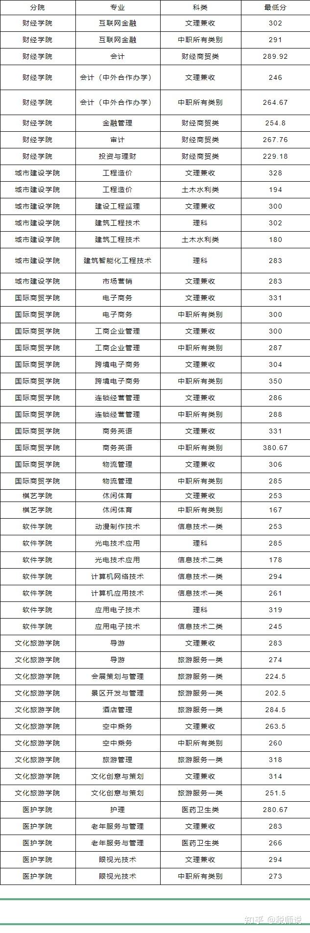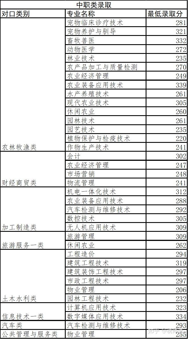 中职类,按参考人数90%划定文化考试最低录取控制分数线为104分,文化成绩上线后按照文化成绩加技能成绩总分由高到低录取。大部分专业分数在280以下,少数专业分数较高,要具体情况具体分析。