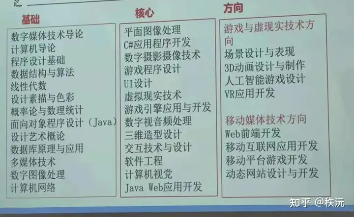 那么在一般大一,大二课程都是基础,小编建议基础肯定要打牢,在本专业中,小编建议要提前了解方向,然后做规划,你对编程感兴趣,那就死压编程,对游戏开发感兴趣,那就死走游戏开发(当然游戏开发是需要编程基础的),对短视频,摄影感兴趣,那就死拿捏那些软件。