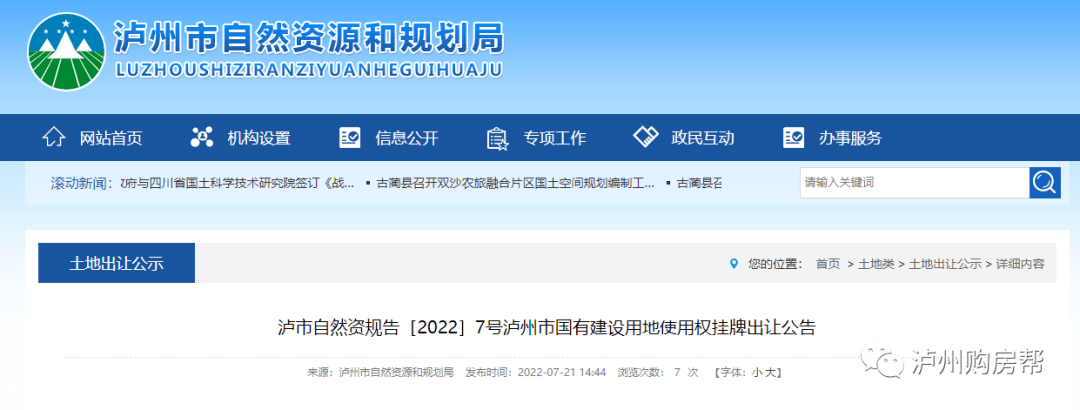 2022年7月21日,泸州市自然资源和规划局发布了(泸市自然资规告【2022】7号)国有建设用地使用权挂牌出让公告。