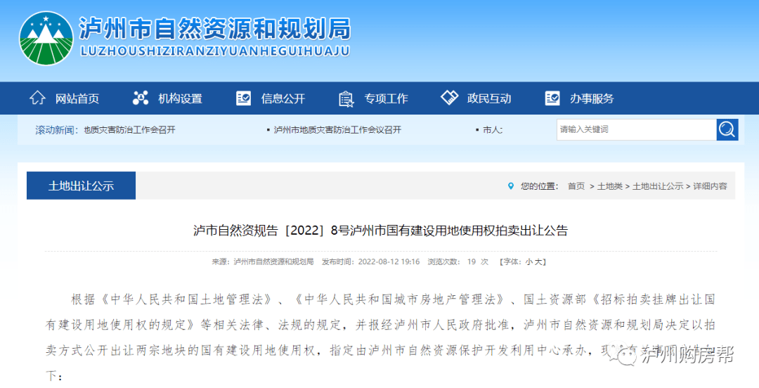 2022年8月12日,泸州市自然资源和规划局发布了(泸市自然资规告【2022】8号)国有建设用地使用权拍卖出让公告、(泸市自然资规告【2022】9号)国有建设用地使用权挂牌出让公告。