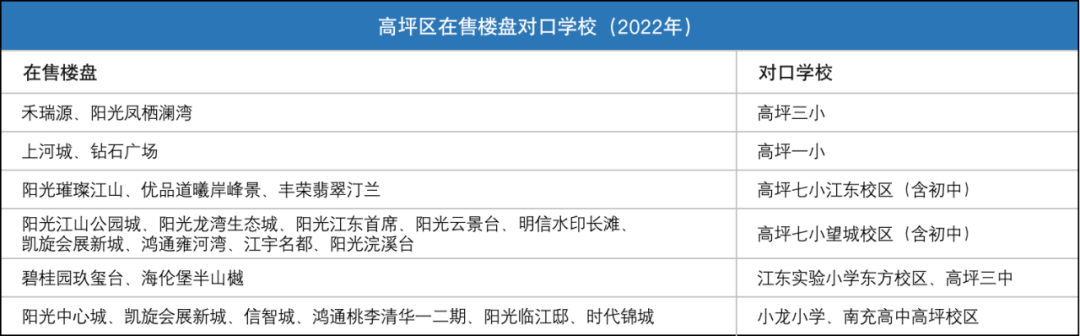按照就近入学原则,统计的高坪25个在售楼盘分别对口有8所中小学。